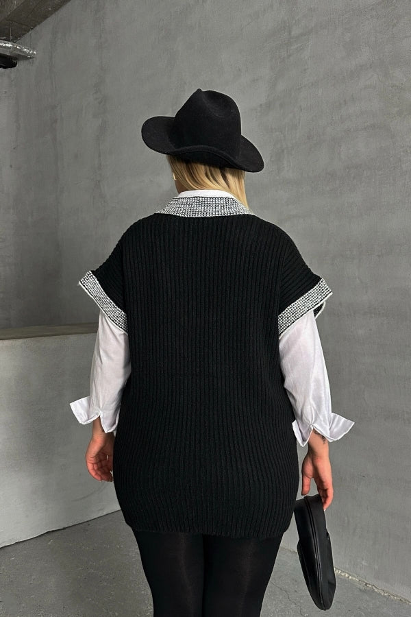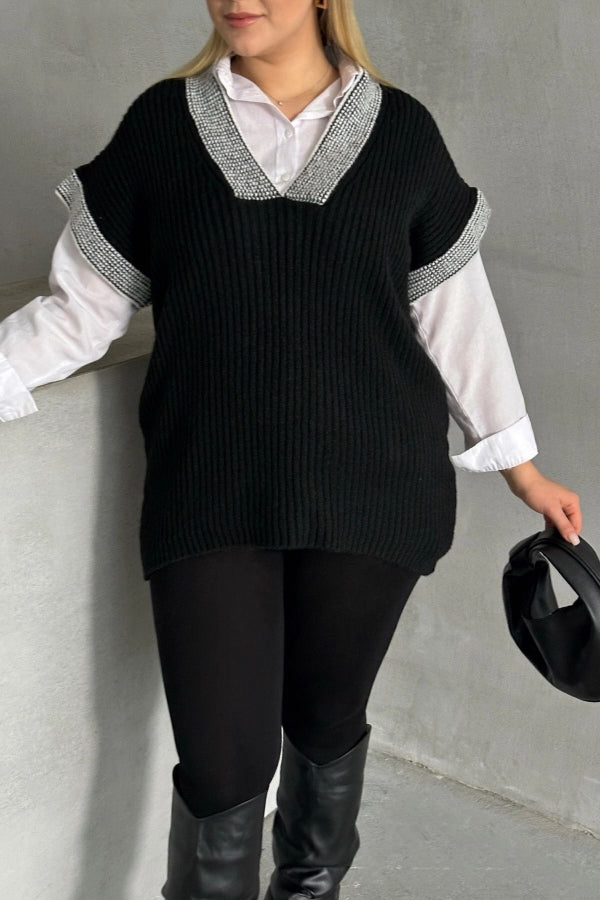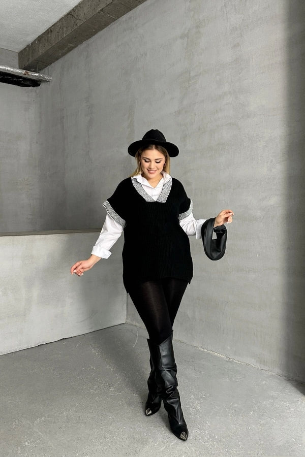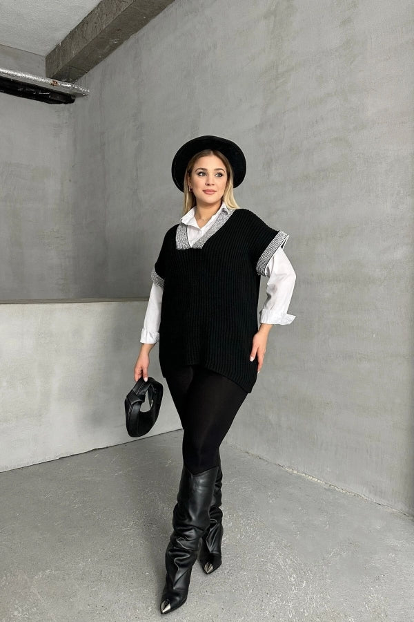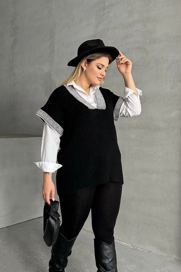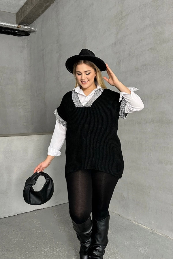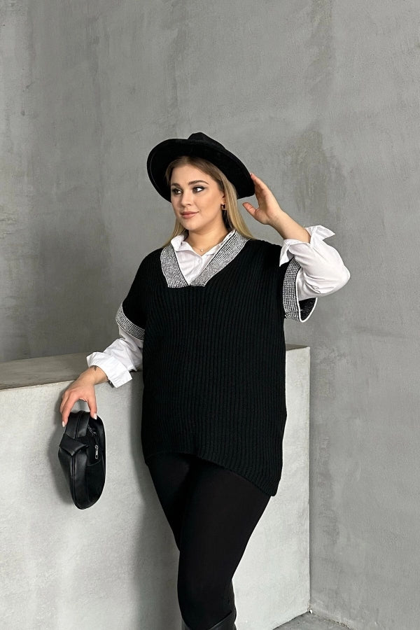 Büyük Beden V Yaka Kısa Kollu Triko Süveter 302139