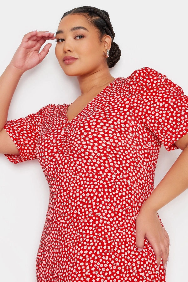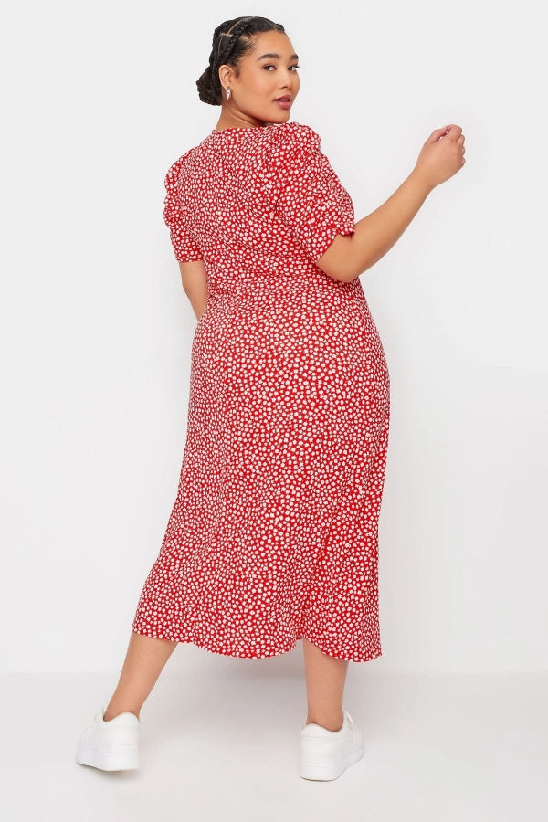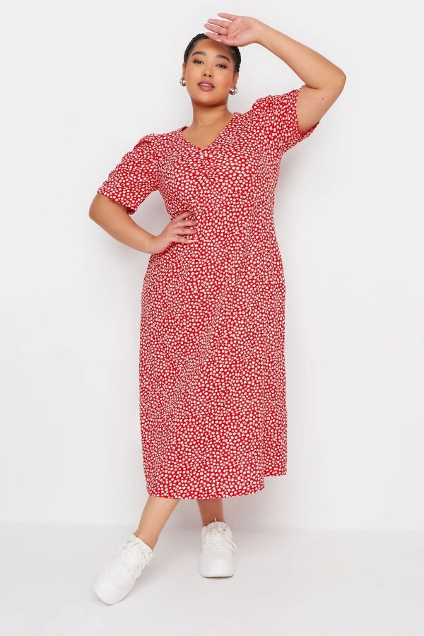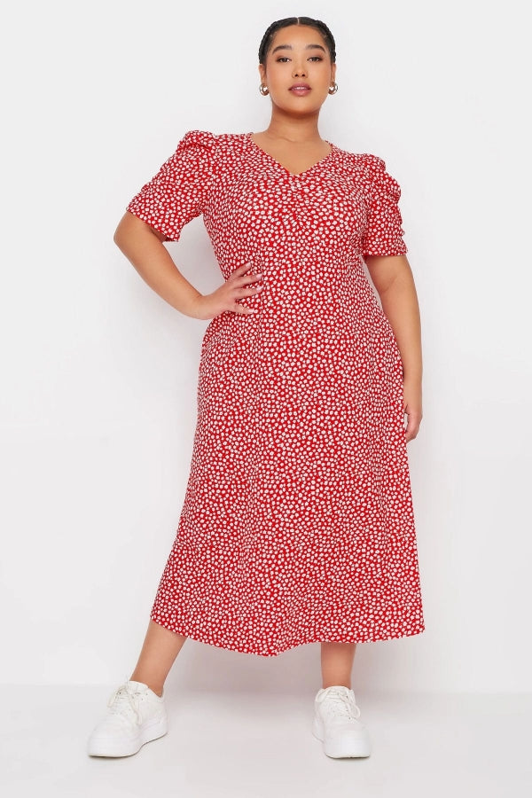 Büyük Beden V Yaka Kolları Drapeli Çiçek Desenli Midi Boy Elbise 137848