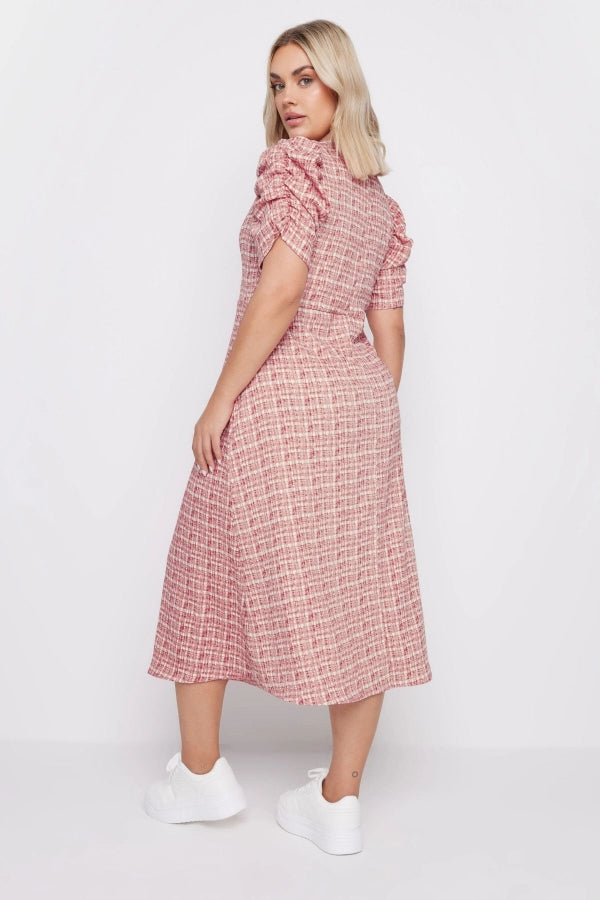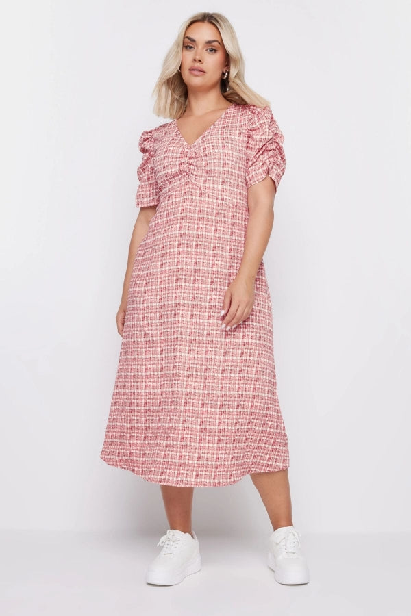 Büyük Beden V Yaka Kolları Drapeli Kare Desenli Midi Boy Elbise 137947