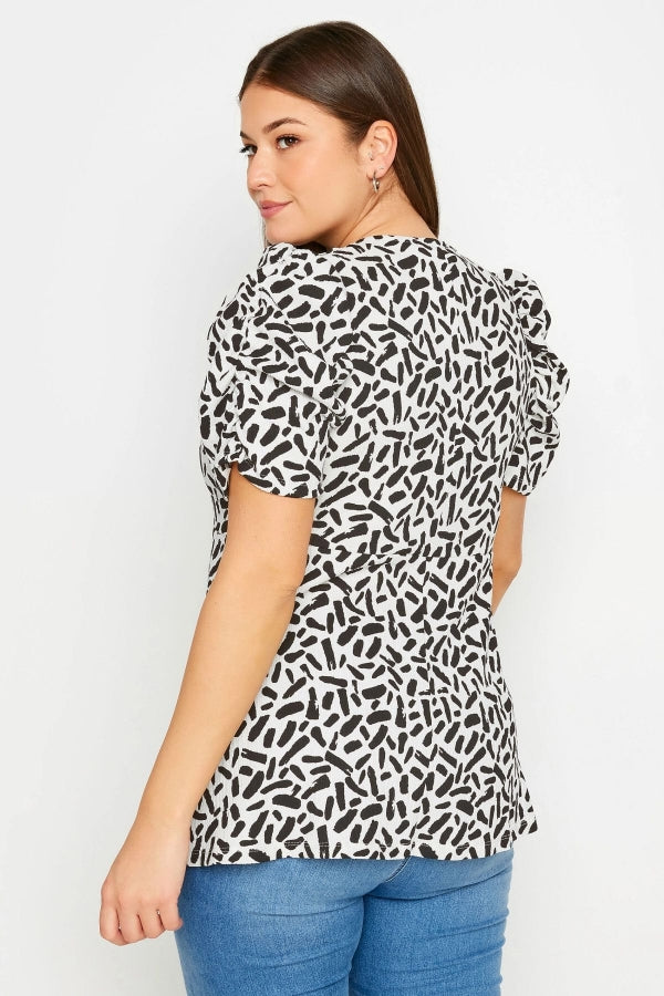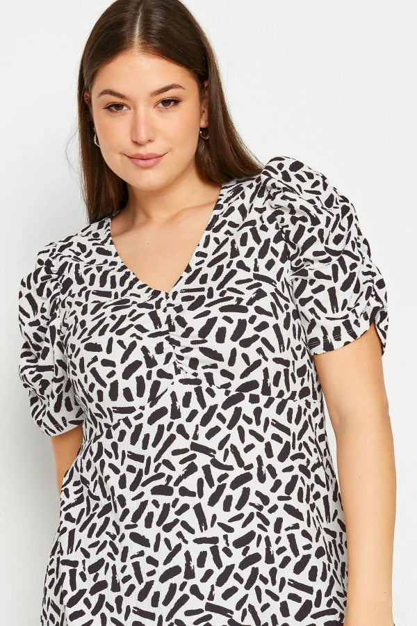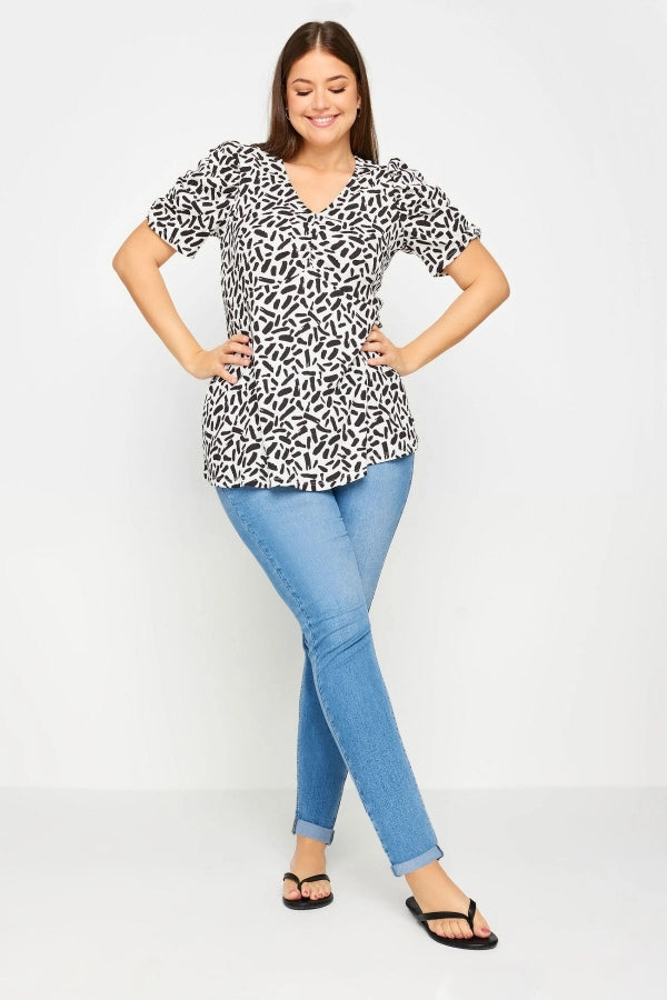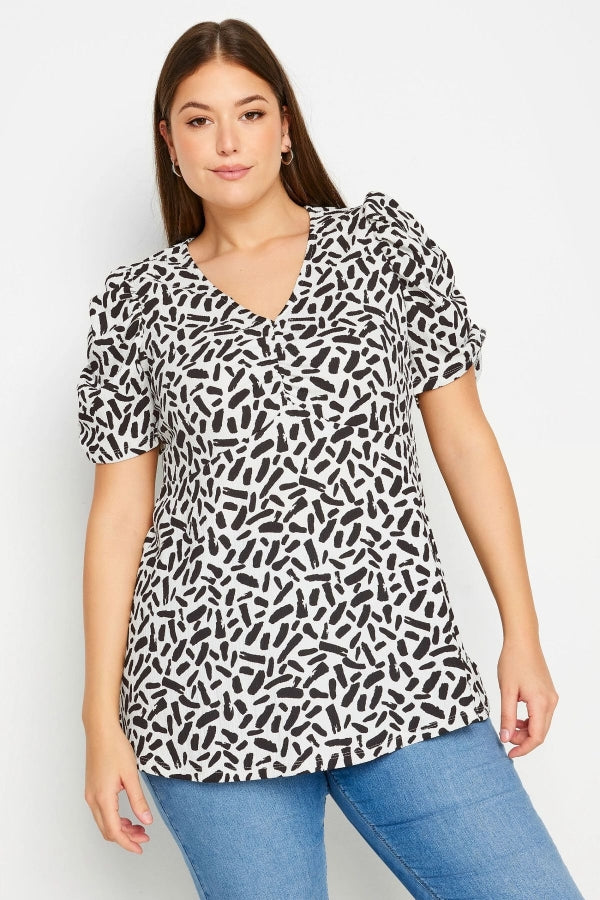 Büyük Beden V Yaka Kolları Drapeli Kısa Kollu Desenli Bluz 321725