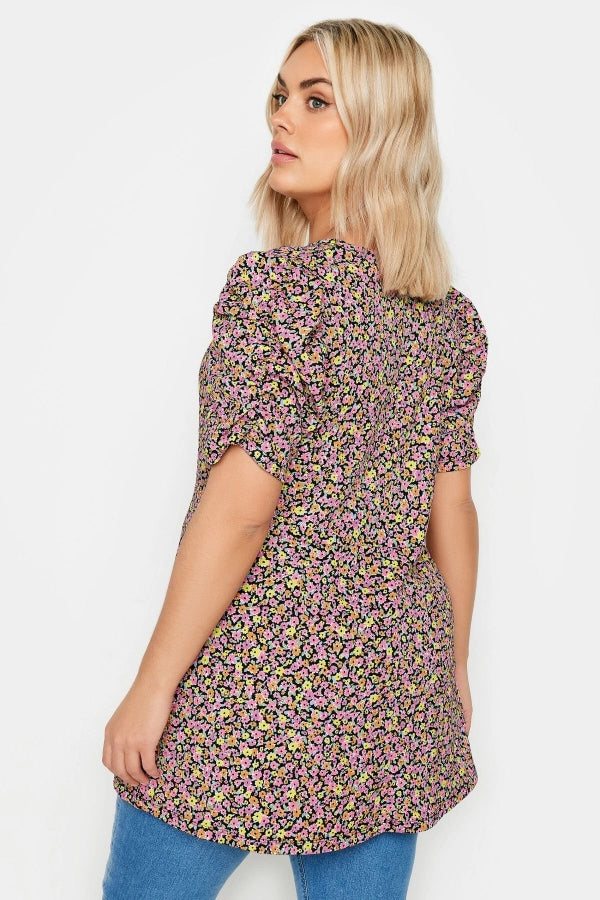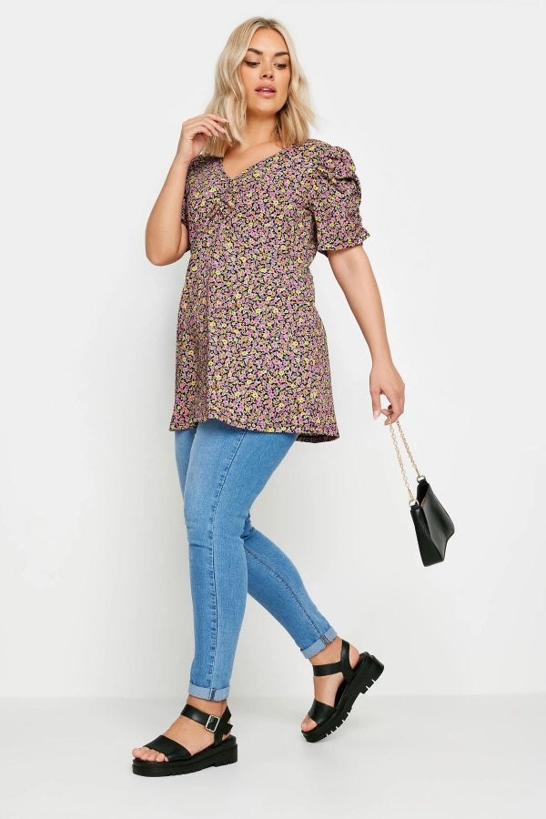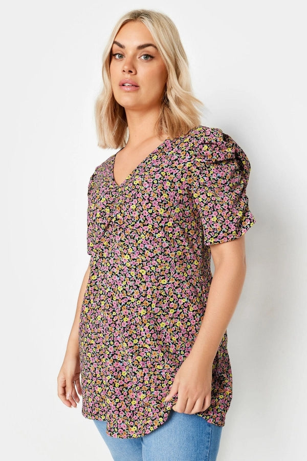Büyük Beden V Yaka Kolları Drapeli Kısa Kollu Desenli Bluz 321726