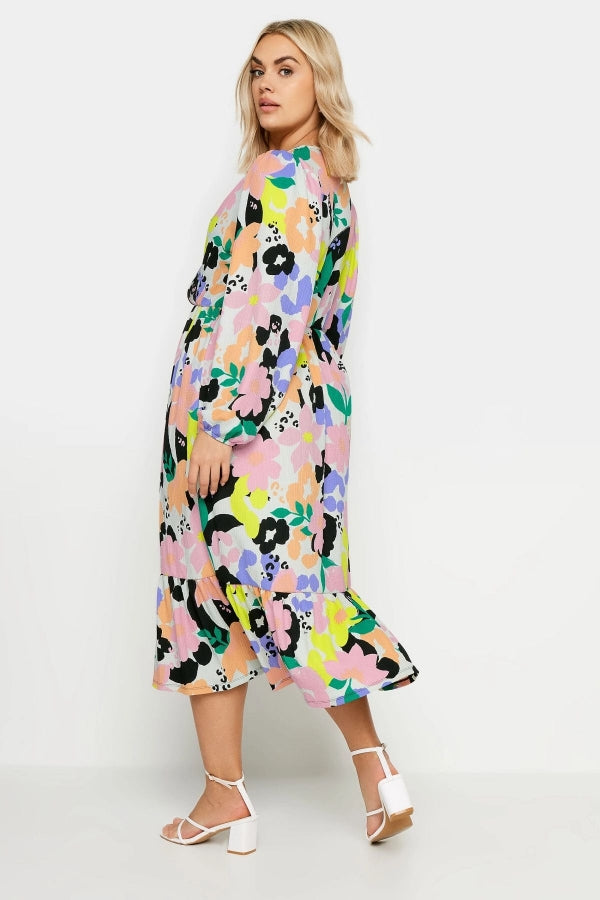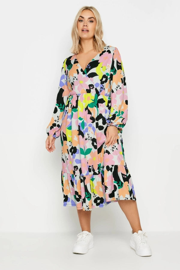 Büyük Beden V Yaka Kolları Lastikli Desenli Midi Boy Anvelop Elbise