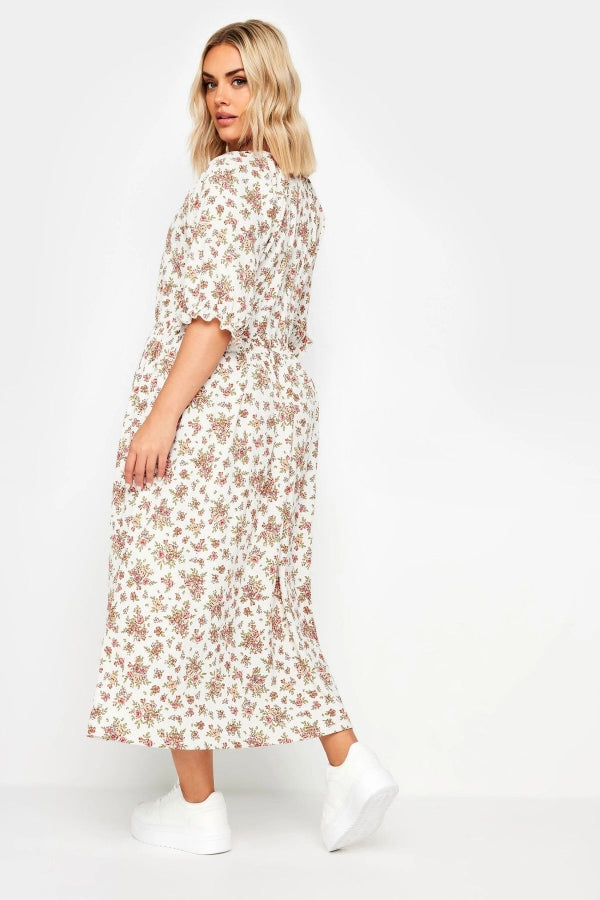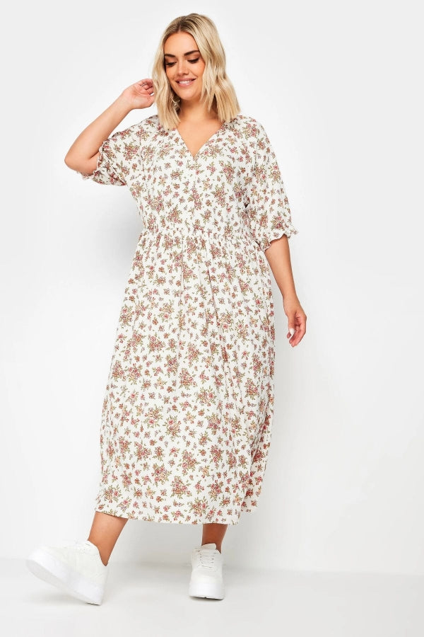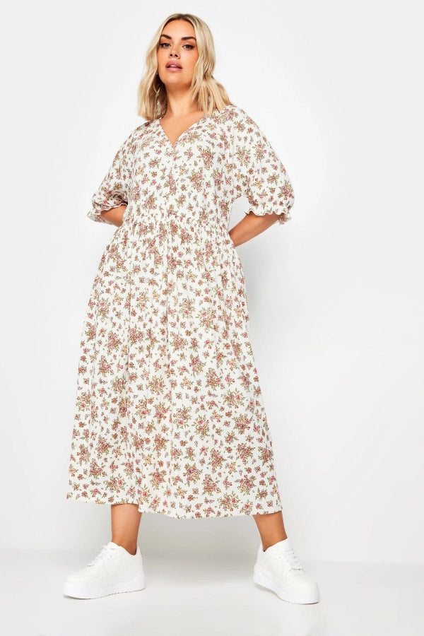 Büyük Beden V Yaka Kolları ve Beli Lastikli Desenli Uzun Elbise 137943