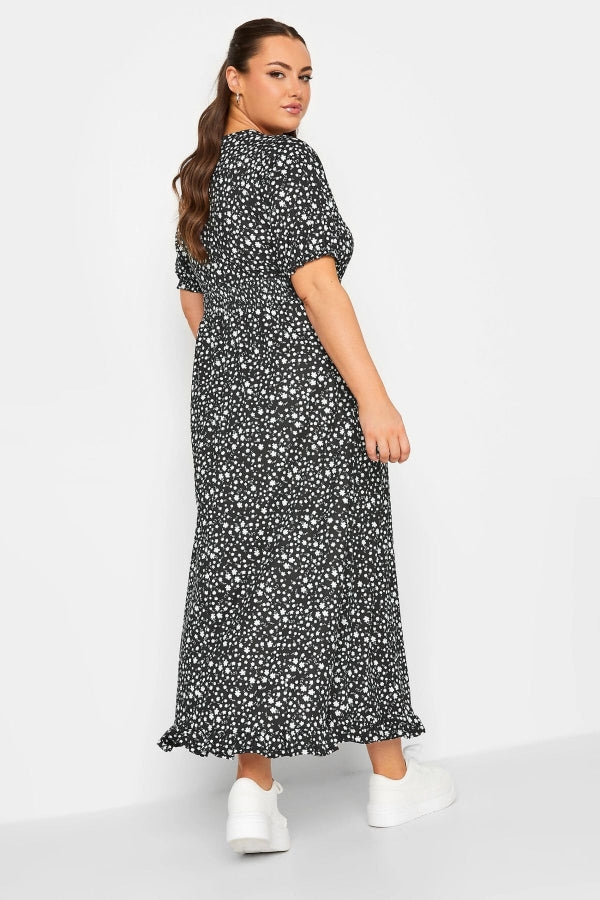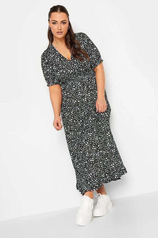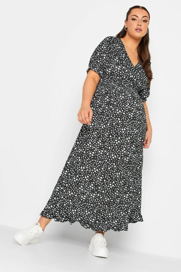 Büyük Beden V Yaka Kolları ve Beli Lastikli Desenli Uzun Elbise 215793