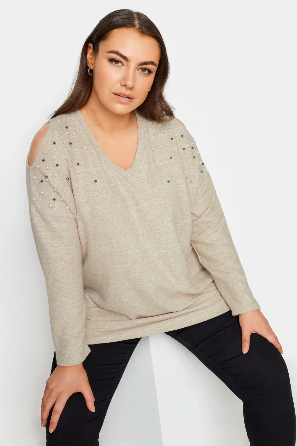 Büyük Beden V Yaka Omuz Detaylı Boncuk İşlemeli Kazak 302776