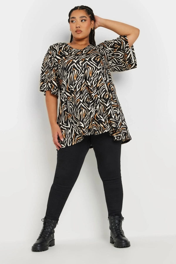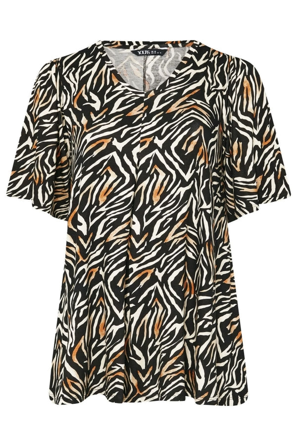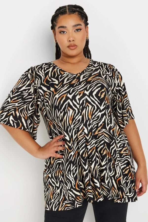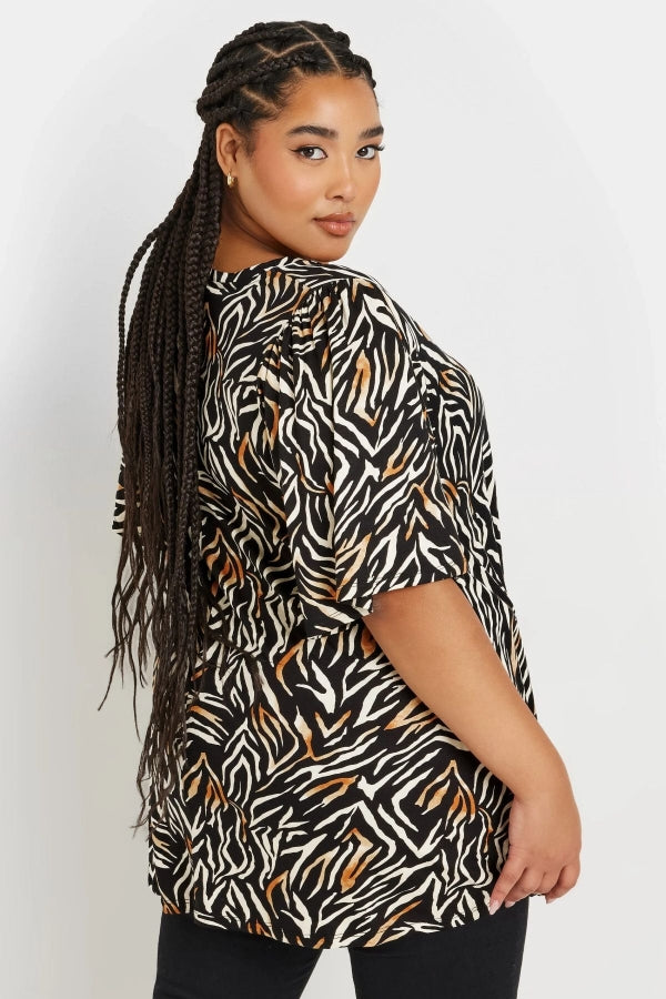 Büyük Beden V Yaka Ön Pileli Kısa Kollu Desenli Bluz 303726