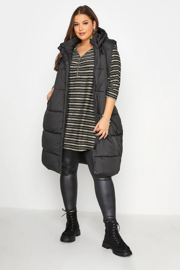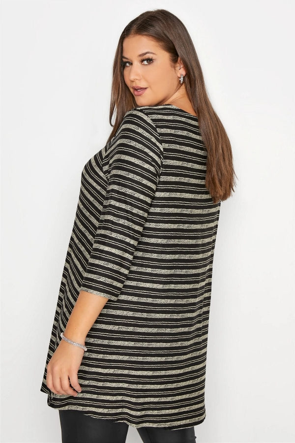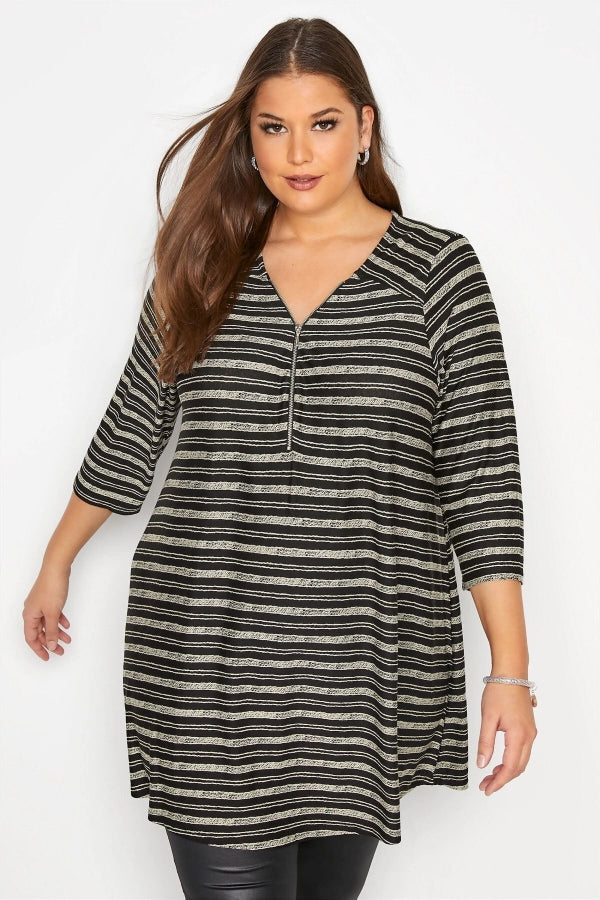 Büyük Beden V Yaka Önü Fermuar Detaylı Yarım Kollu Çizgili Tunik 173690