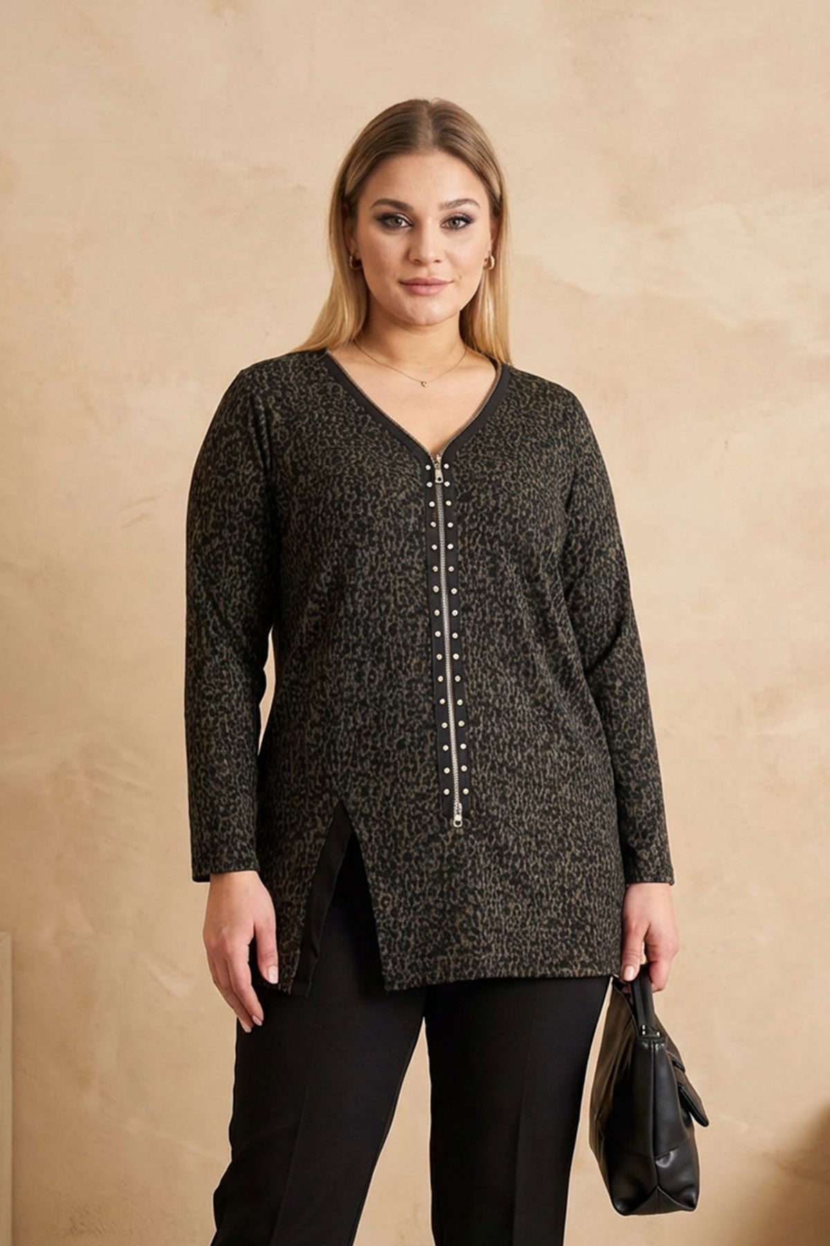 Büyük Beden V Yaka Önü Fermuarlı Yırtmaç Detaylı Leopar Desenli Bluz 173672