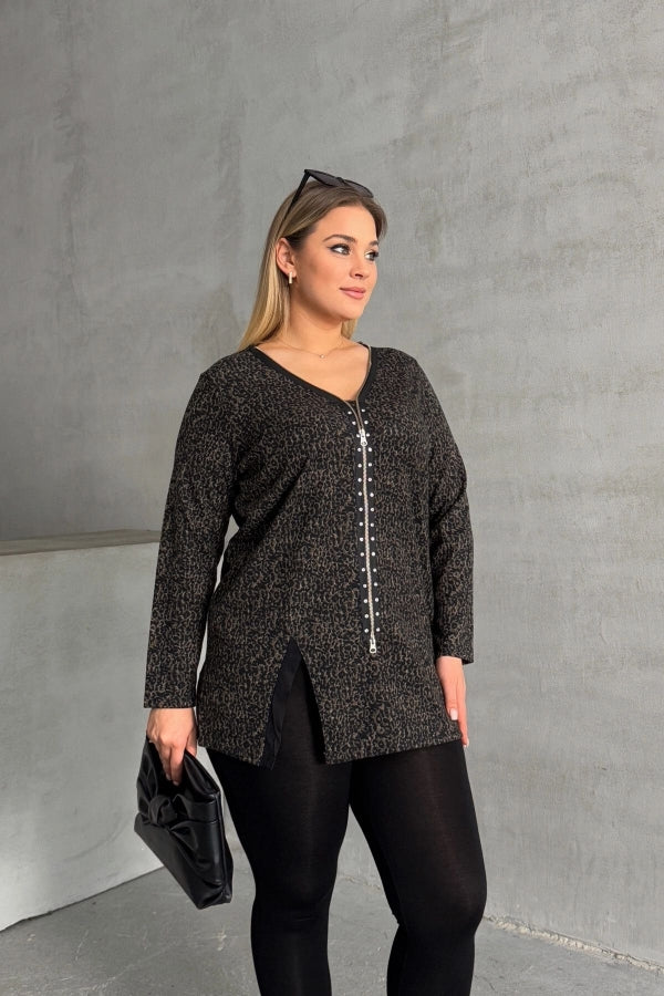 Büyük Beden V Yaka Önü Fermuarlı Yırtmaç Detaylı Leopar Desenli Bluz 173672