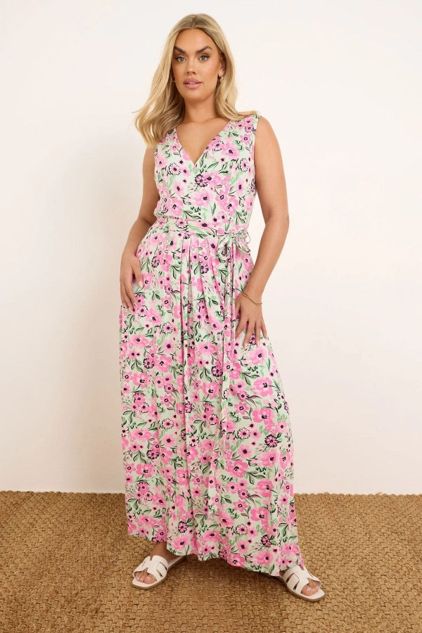 Büyük Beden V Yaka Sıfır Kol Beli Kuşaklı Desenli Maxi Elbise 303990