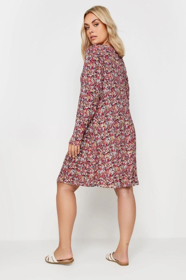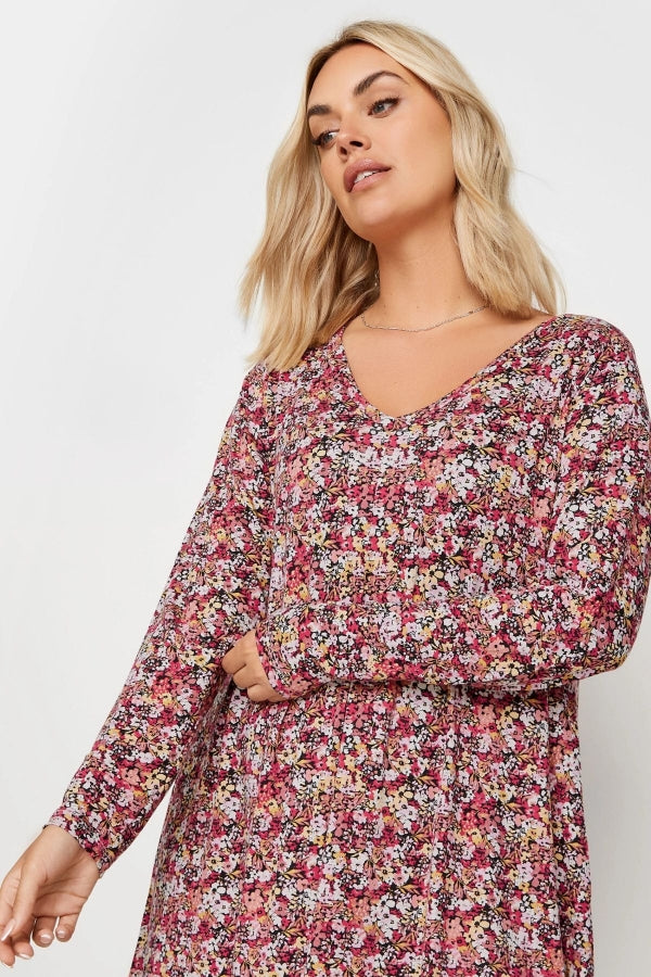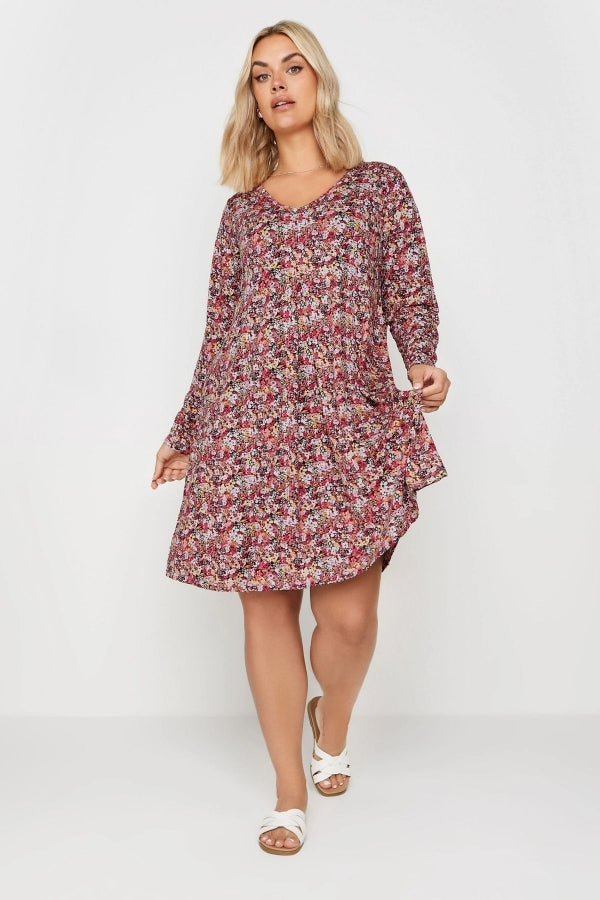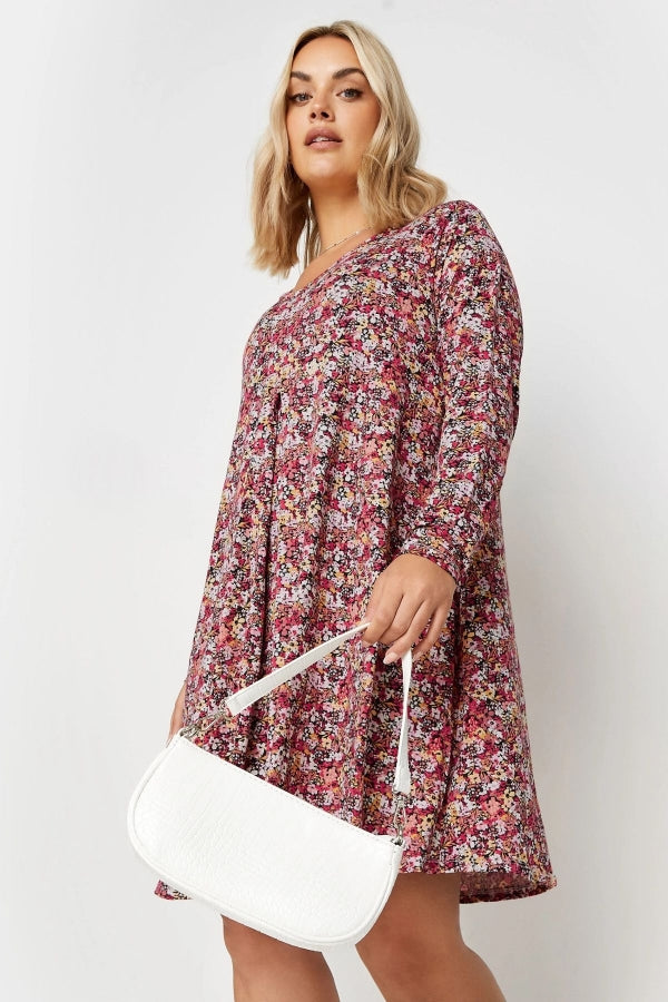 Büyük Beden V Yaka Uzun Kollu Çiçek Desenli Kısa Elbise 302807