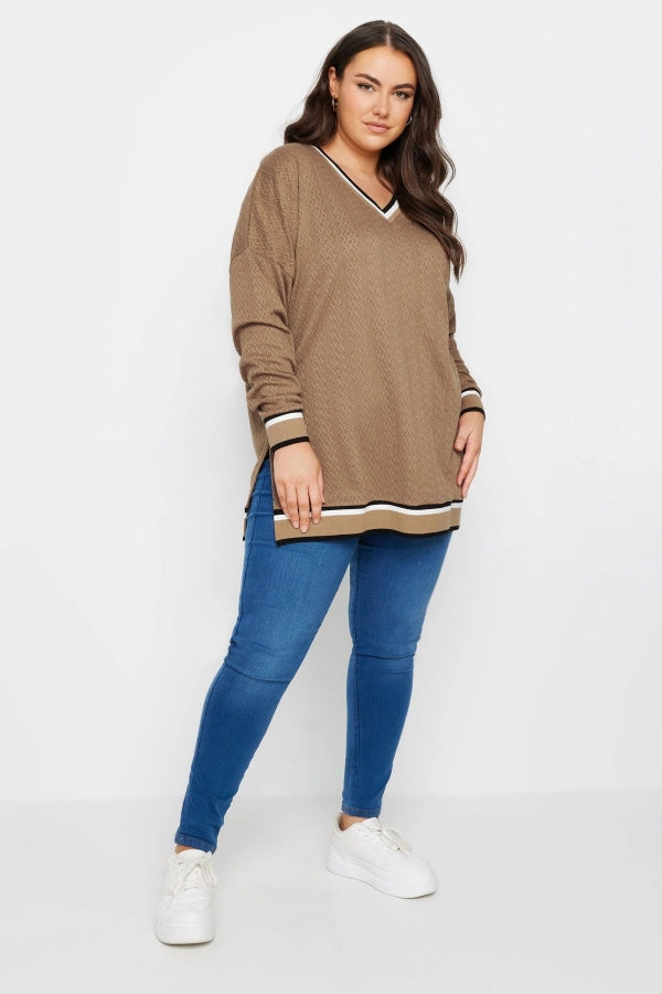 Büyük Beden V Yaka Uzun Kollu Şerit Detaylı Örgü Kazak 303221
