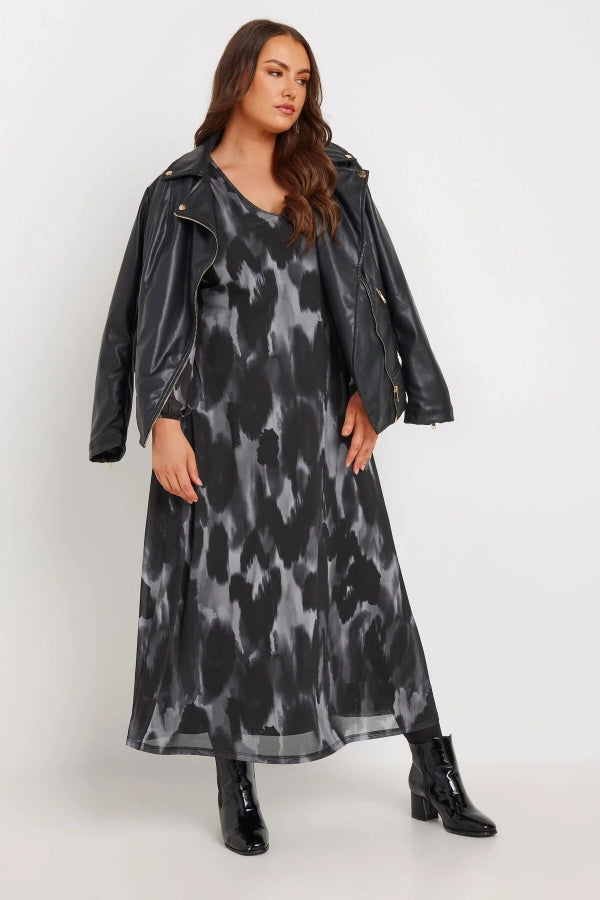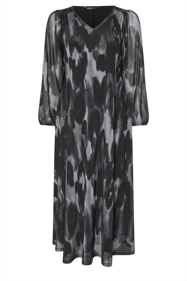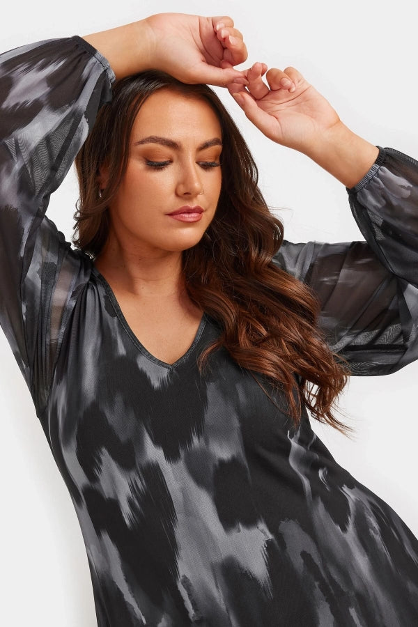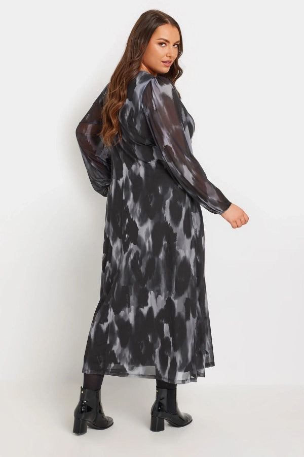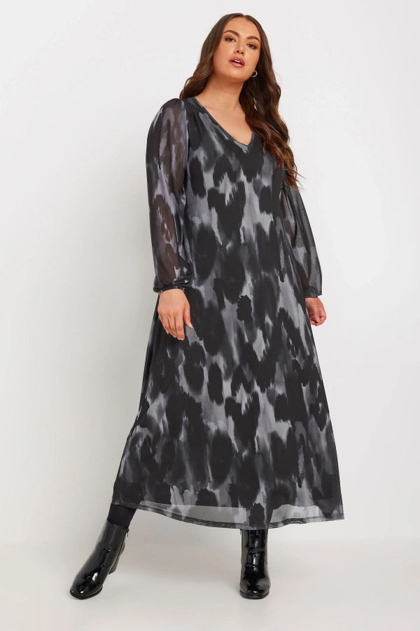 Büyük Beden V Yaka Uzun Tül Kollu Uzun Kesim Elbise 270031