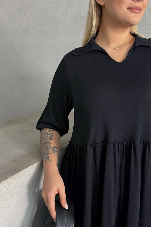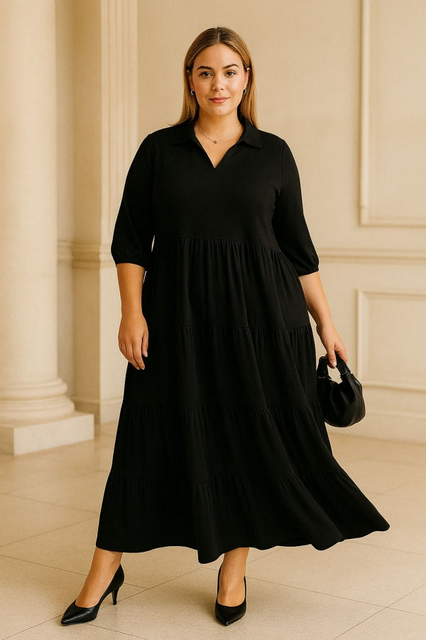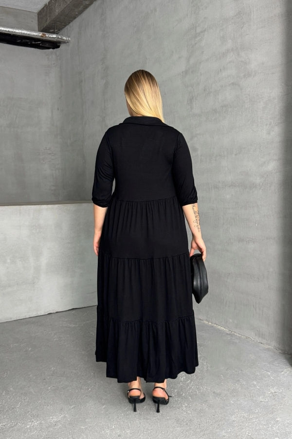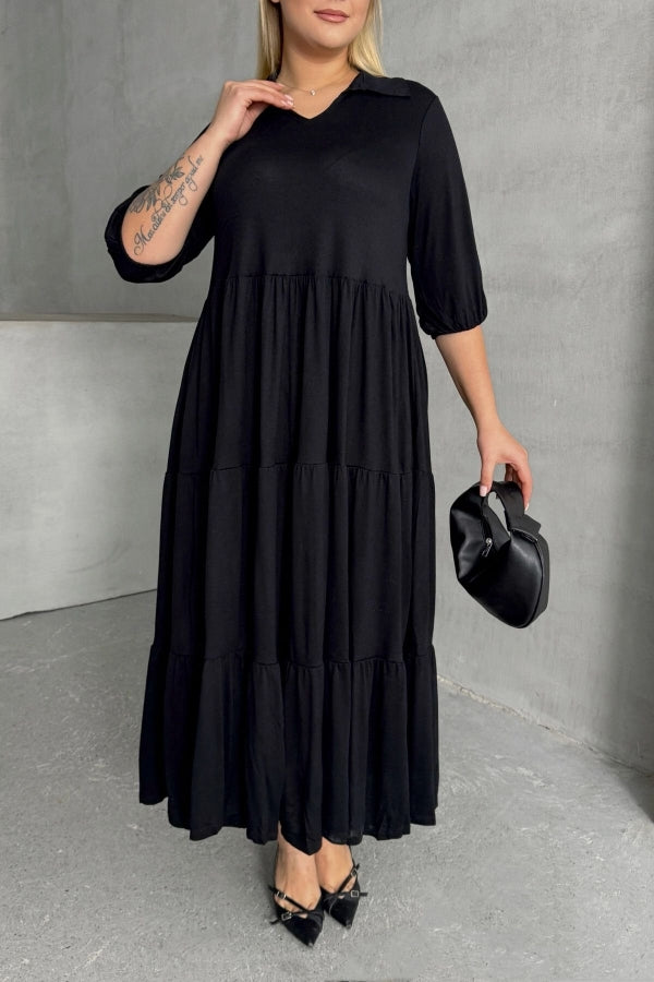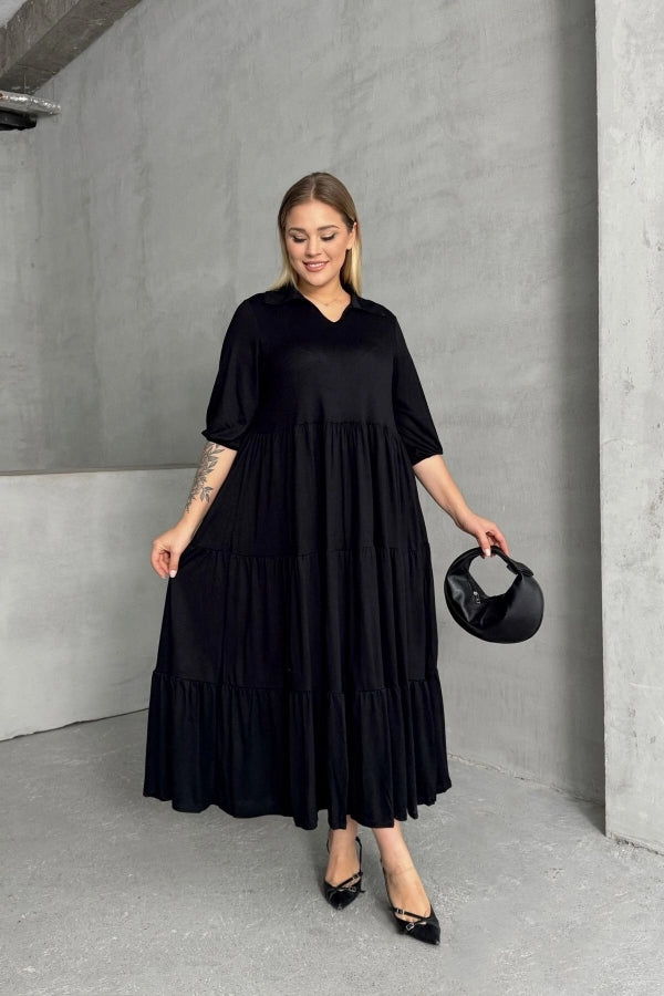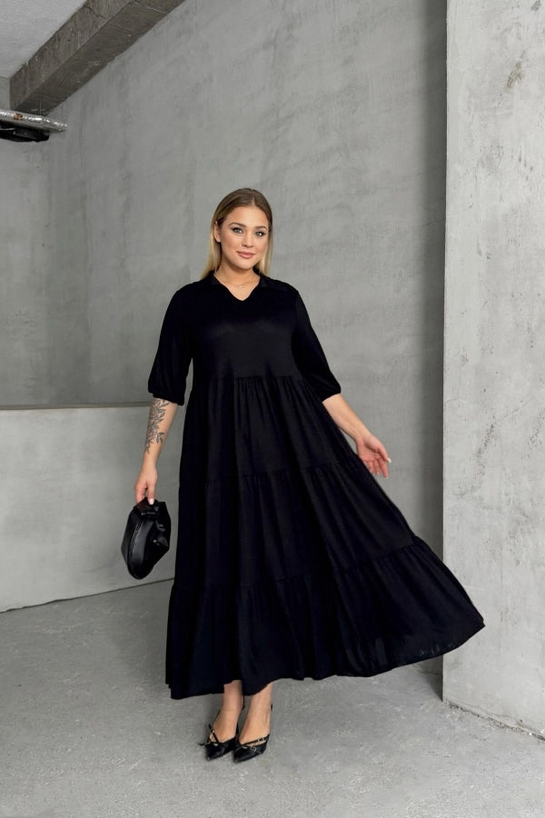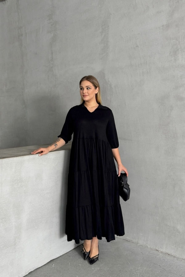 Büyük Beden V Yaka Yarım Kollu Beli Lastikli Uzun Elbise 302150