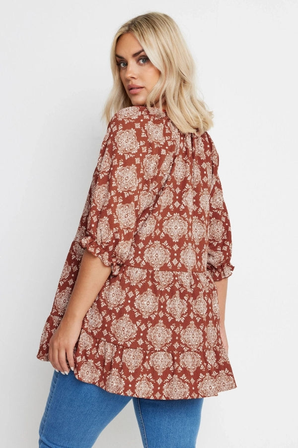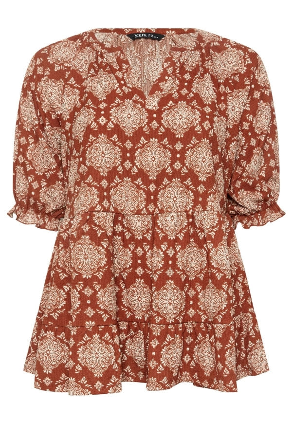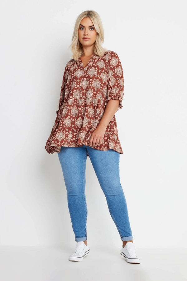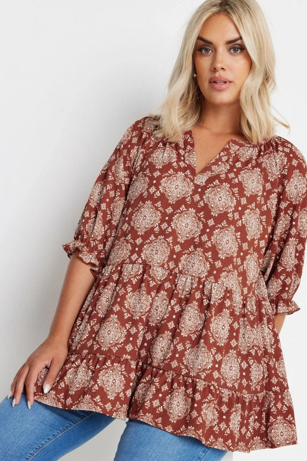 Büyük Beden V Yaka Yarım Kollu Fırfır Detaylı Desenli Bluz 321990