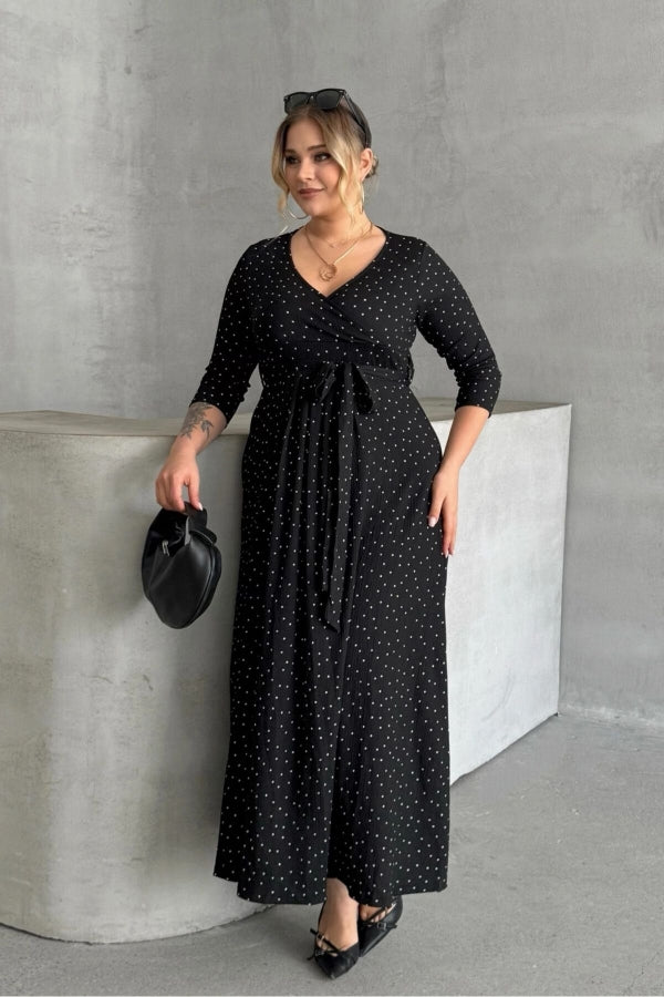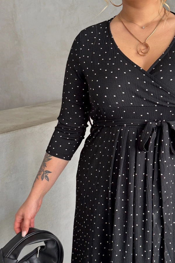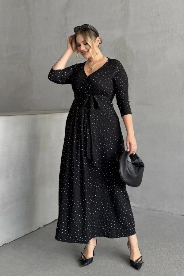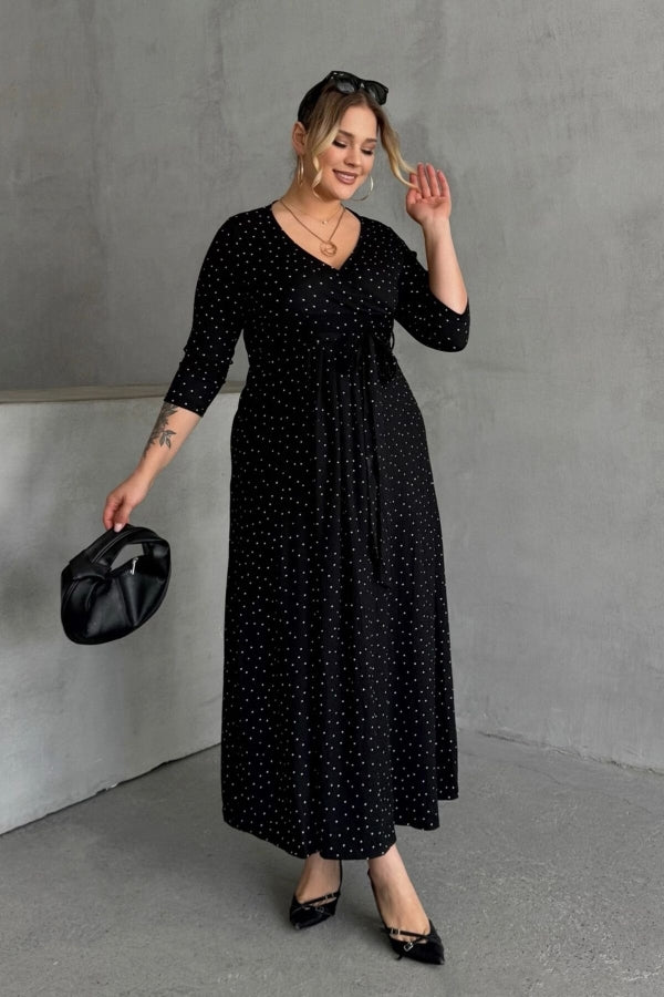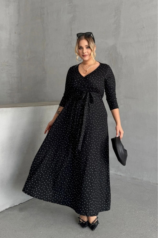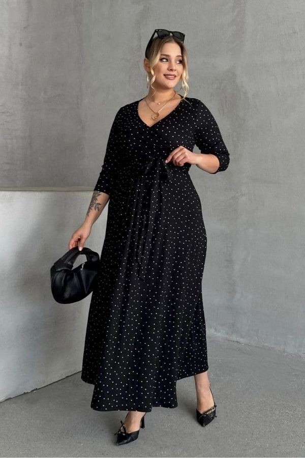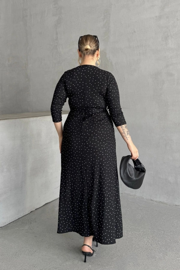 Büyük Beden V Yaka Yarım Kollu Kuşaklı Puantiye Desenli Elbise 302639