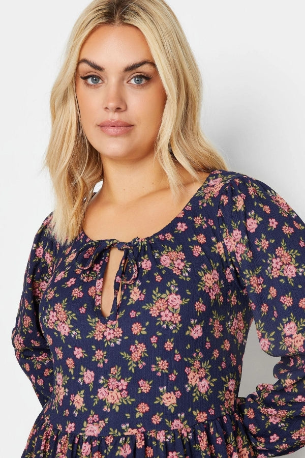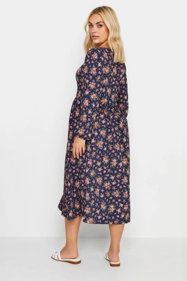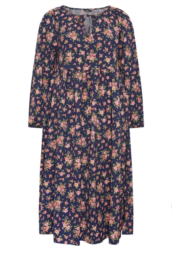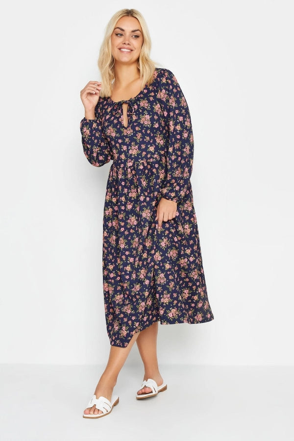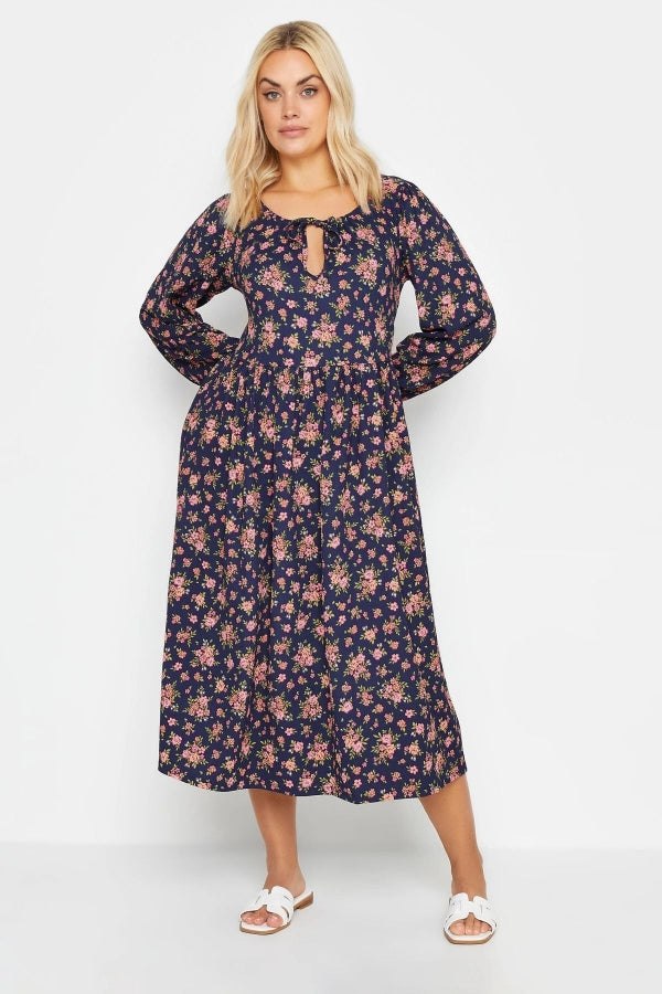 Büyük Beden Yakası Bağlama Detaylı Uzun Kollu Çiçek Desenli Elbise 137781