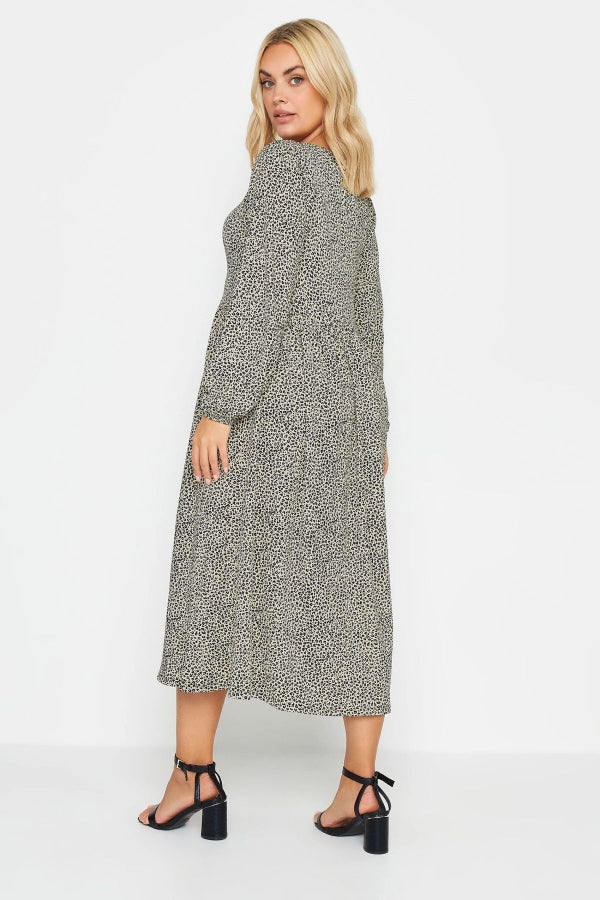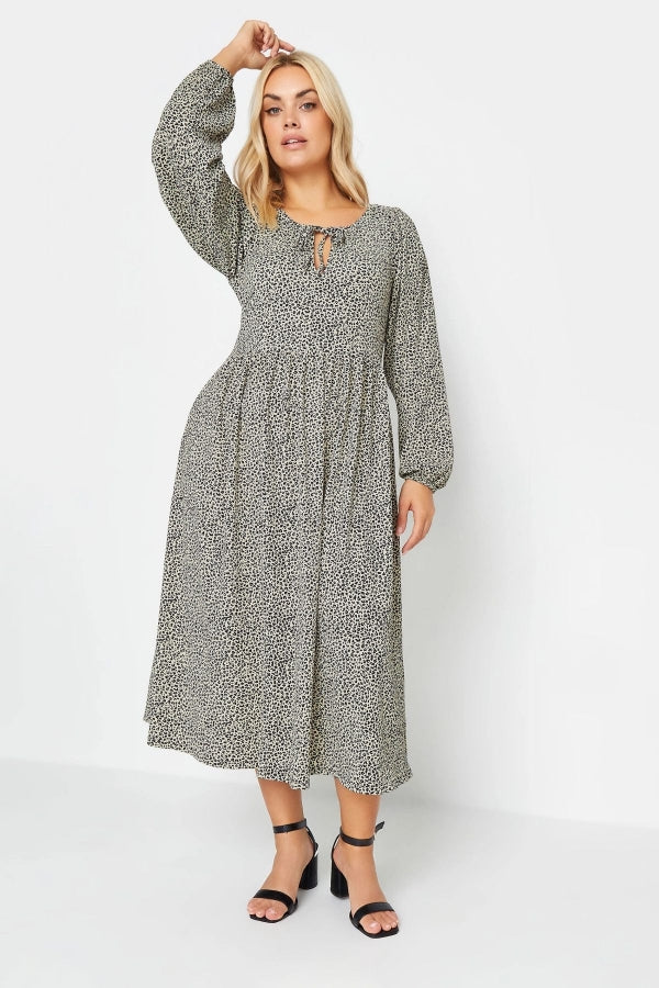 Büyük Beden Yakası Bağlama Detaylı Uzun Kollu Leopar Desenli Elbise 137780