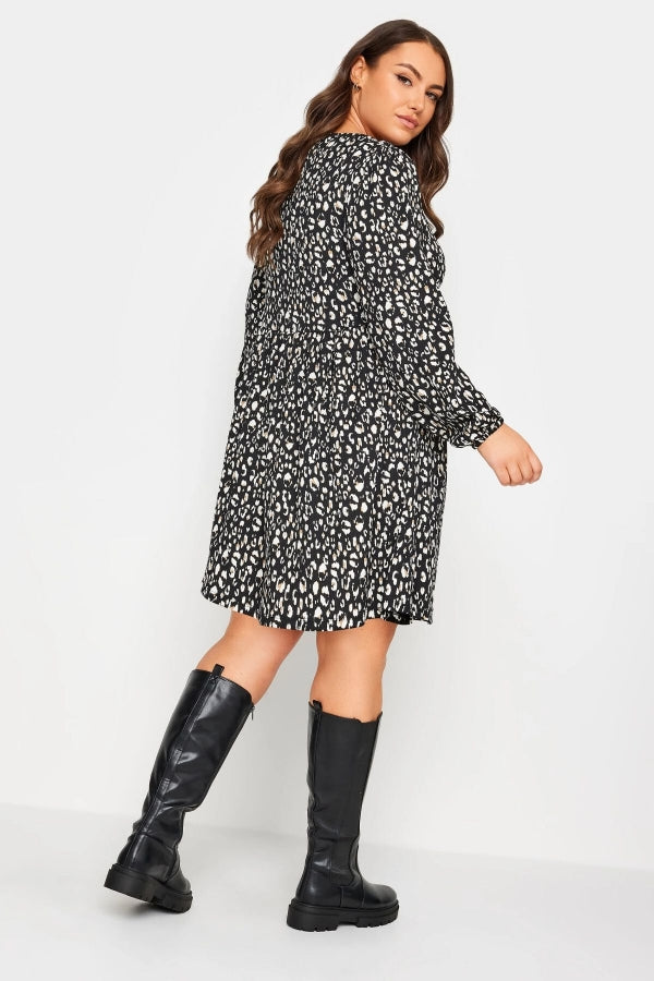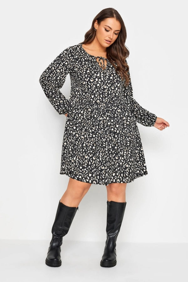 Büyük Beden Yakası Bağlama Detaylı Uzun Kollu Leopar Desenli Kısa Elbise 302690