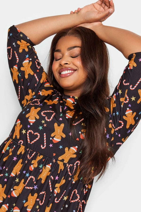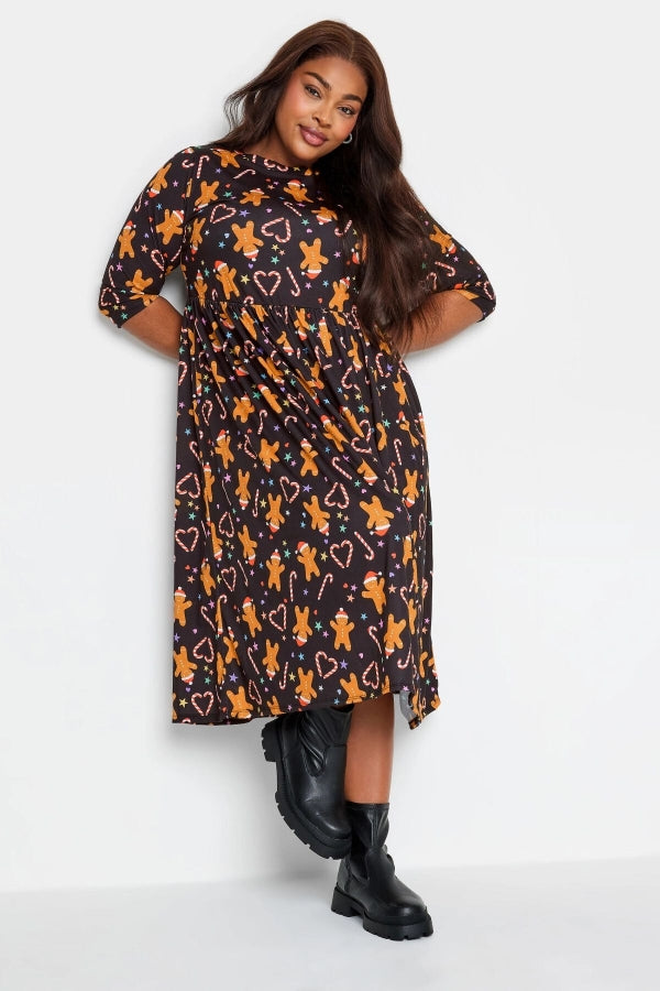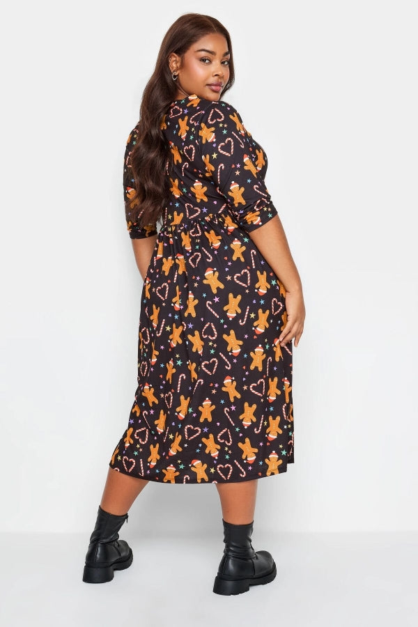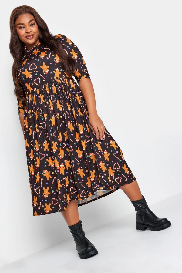 Büyük Beden Yılbaşı Temalı Bisiklet Yaka Yarım Kollu Midi Boy Elbise 215943