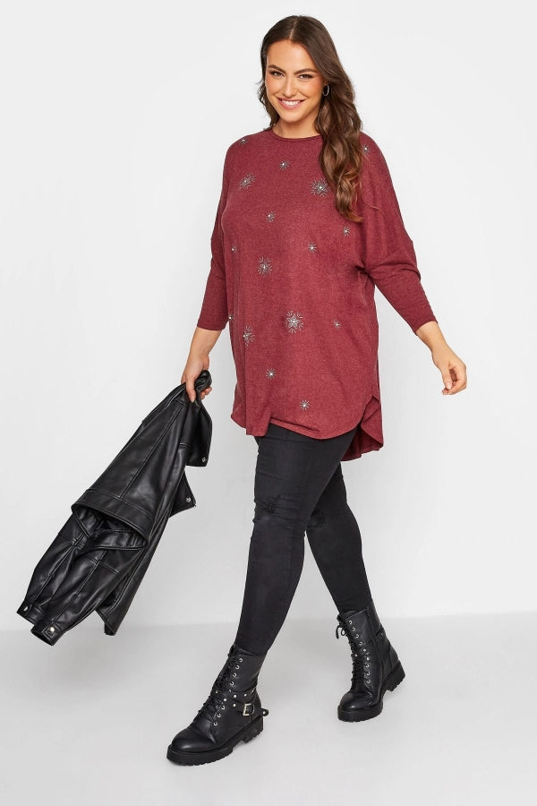 Büyük Beden Yıldız Taş İşleme Detaylı Bisiklet Yaka Yarasa Kol Bluz 300221