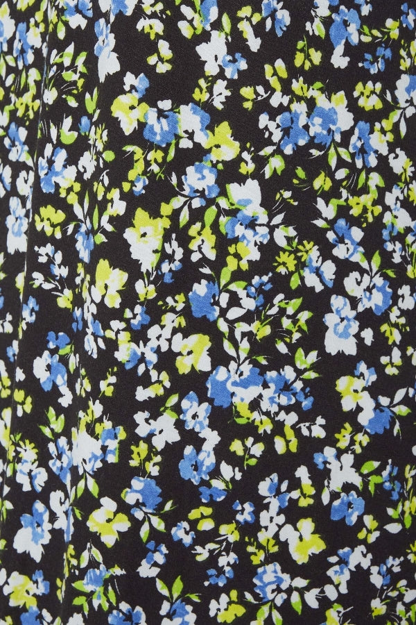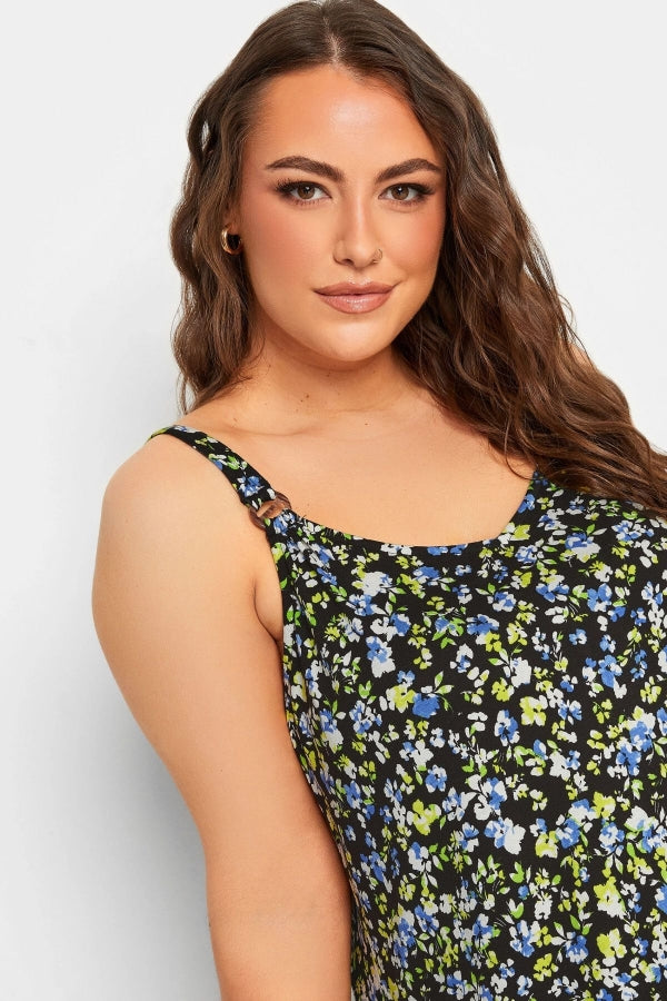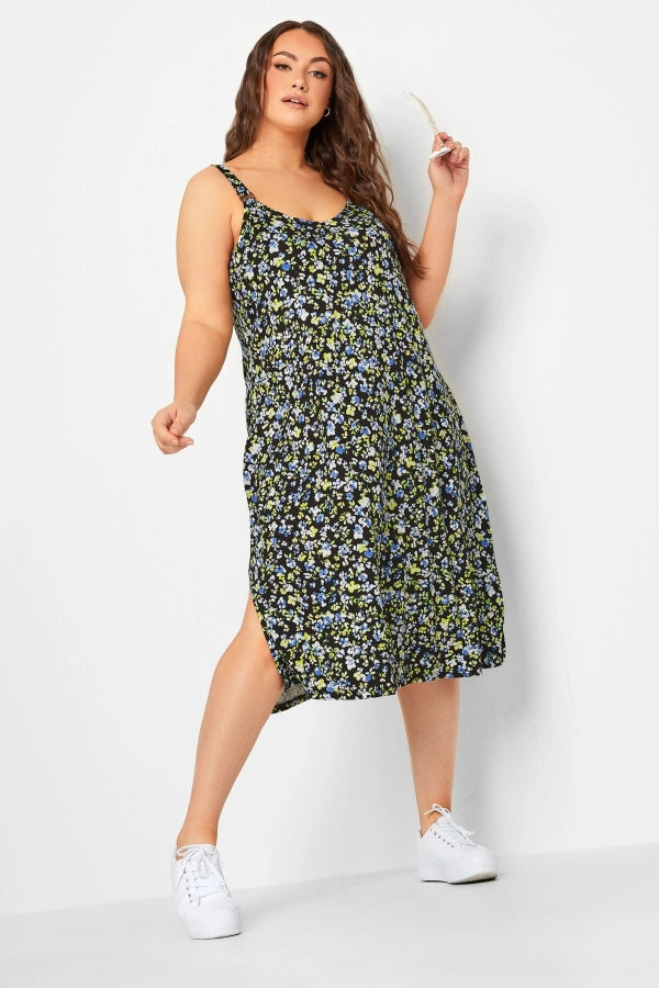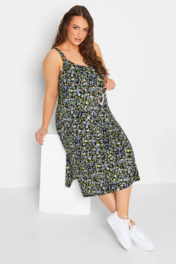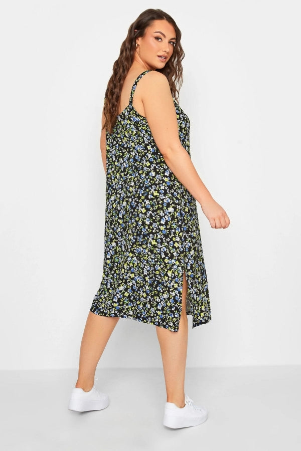 Büyük Beden Yırtmaç Detaylı Çiçek Desenli Askılı Elbise 302296