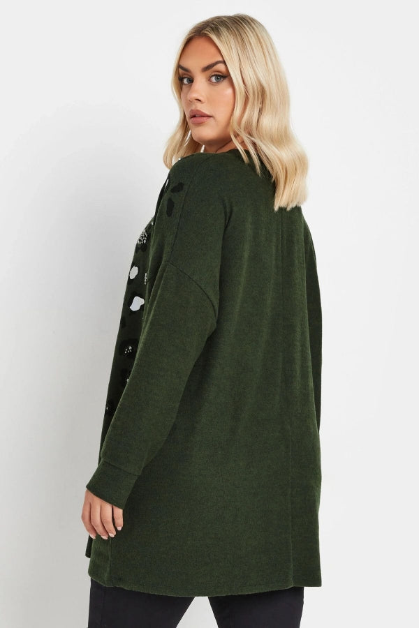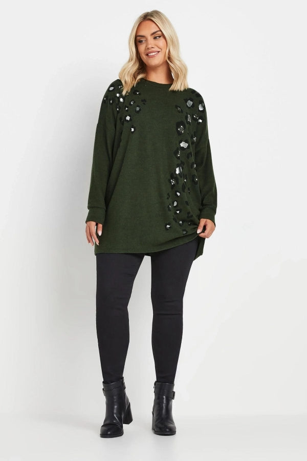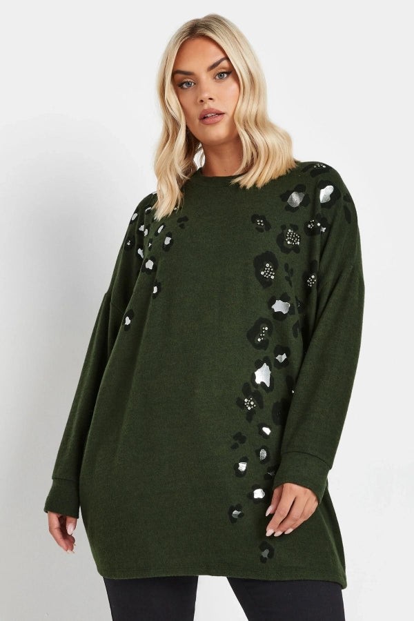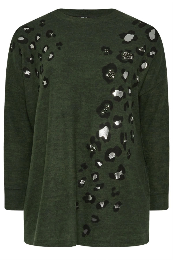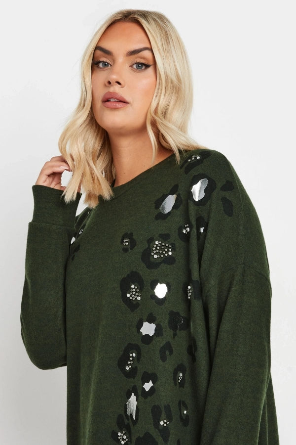 Büyük Beden Yumuşak Dokulu Leopar Baskılı Uzun Kollu Kazak 322222