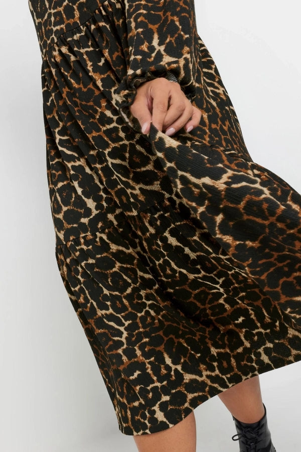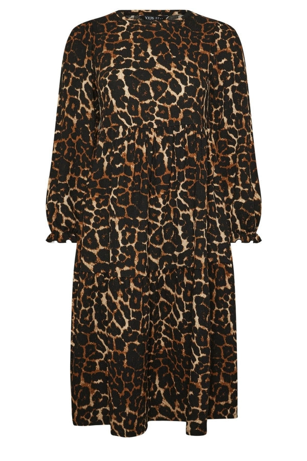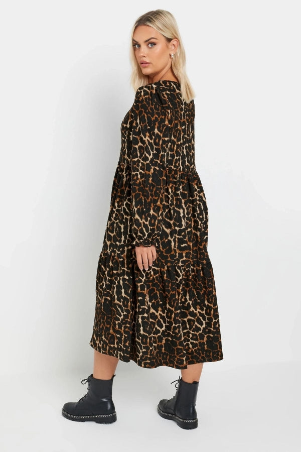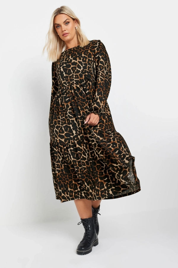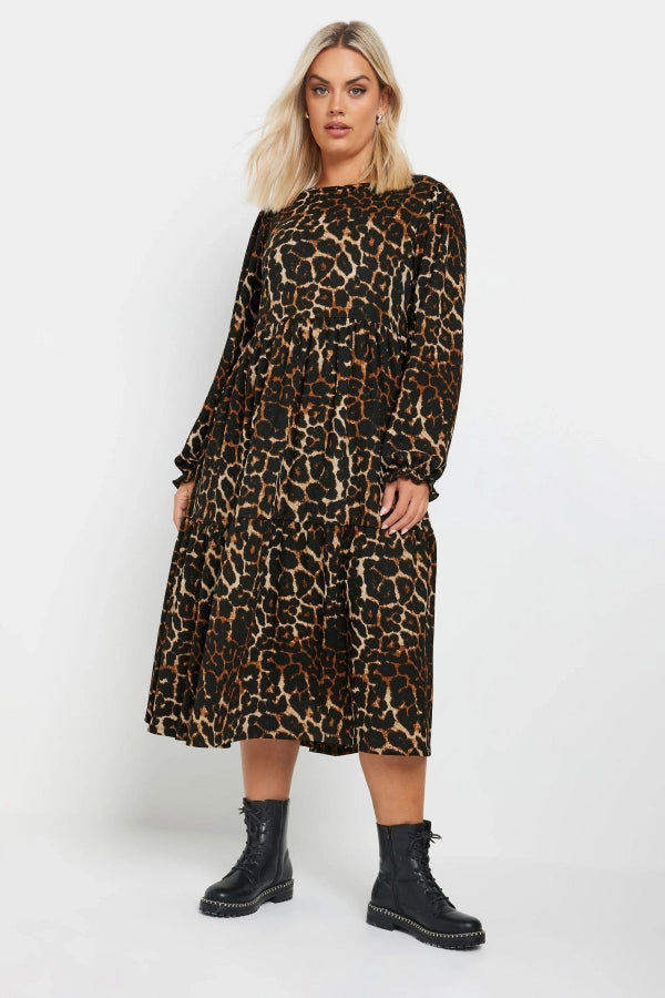 Büyük Beden Yumuşak Dokulu Leopar Desenli Balon Kol Elbise 270014