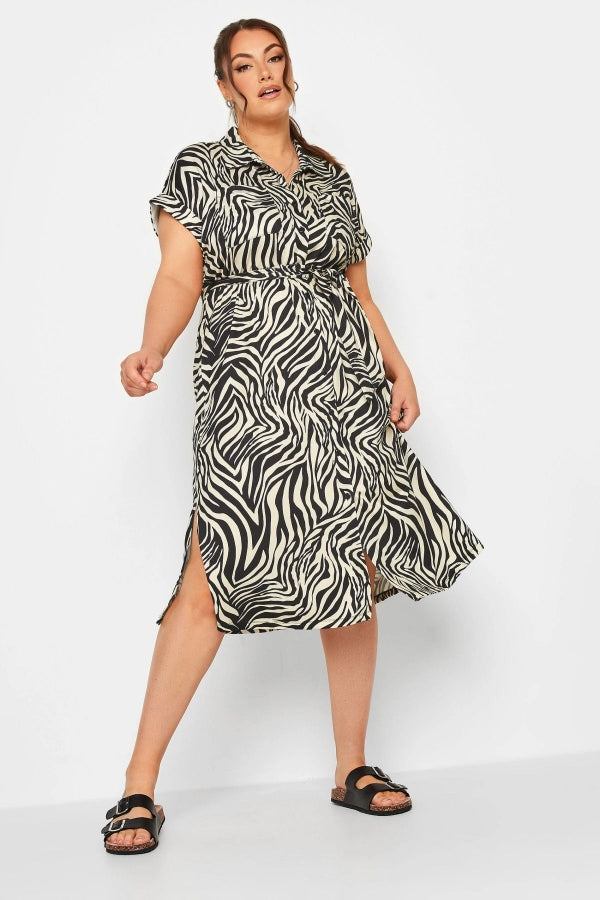 Büyük Beden Zebra Desenli Kuşaklı Likralı Gömlek Elbise 302079